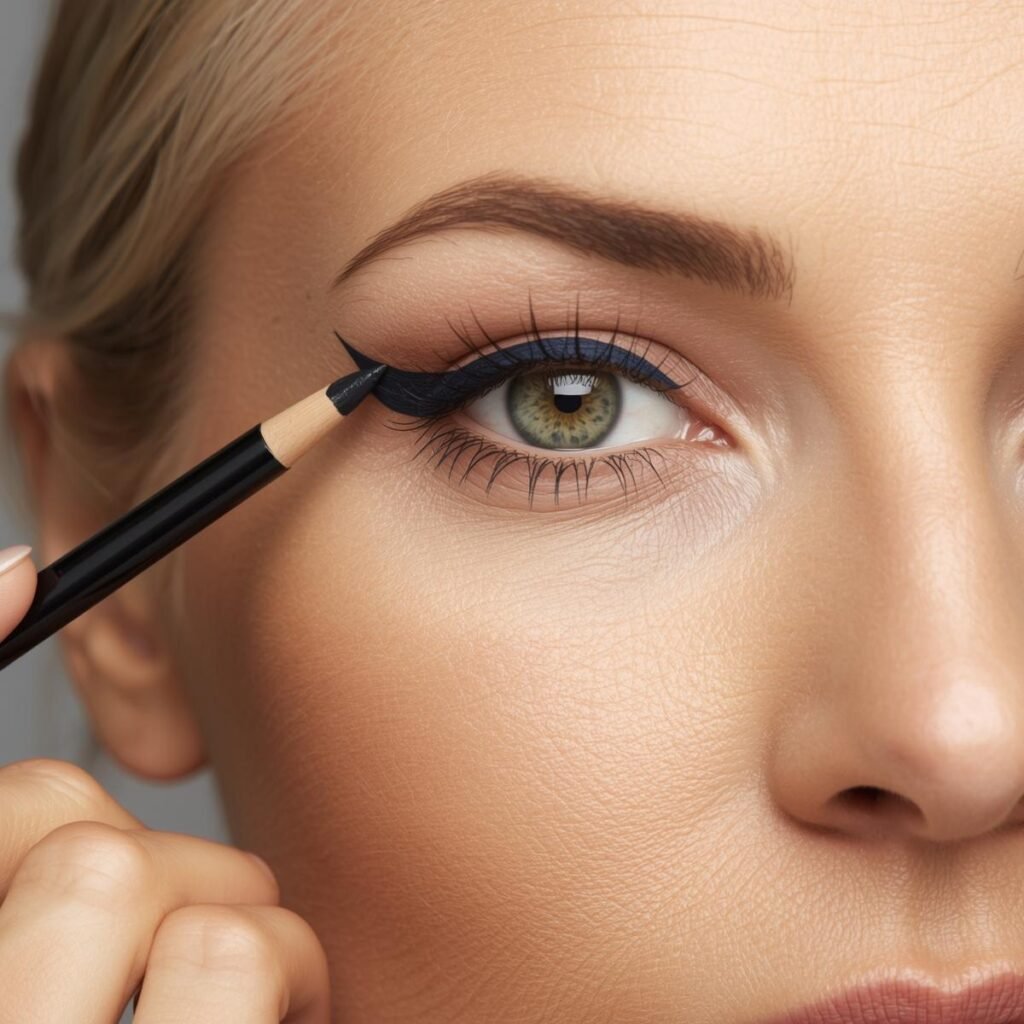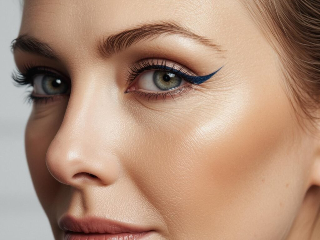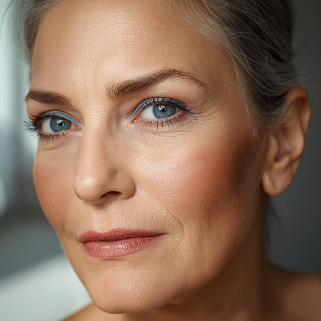 A tiny navy or cobalt dot placed right at the outer corner or below the pupil adds a subtle pop of color without a full liner look. It’s modern, playful, and surprisingly flattering on mature eyes.